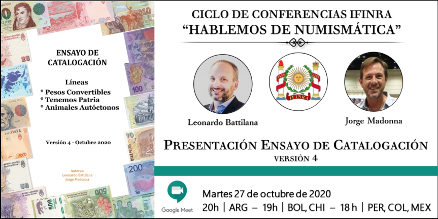 Los invitamos a ver la charla dada el dia 6 de octubre de 2020 en el marco del ciclo de conferencias «Hablemos de Numismática» acerca de la «Ensayo de Catalogación. Líneas: Pesos convertibles; Tenemos Patria; Animales autóctonos. Version 4: Octubre 2020»